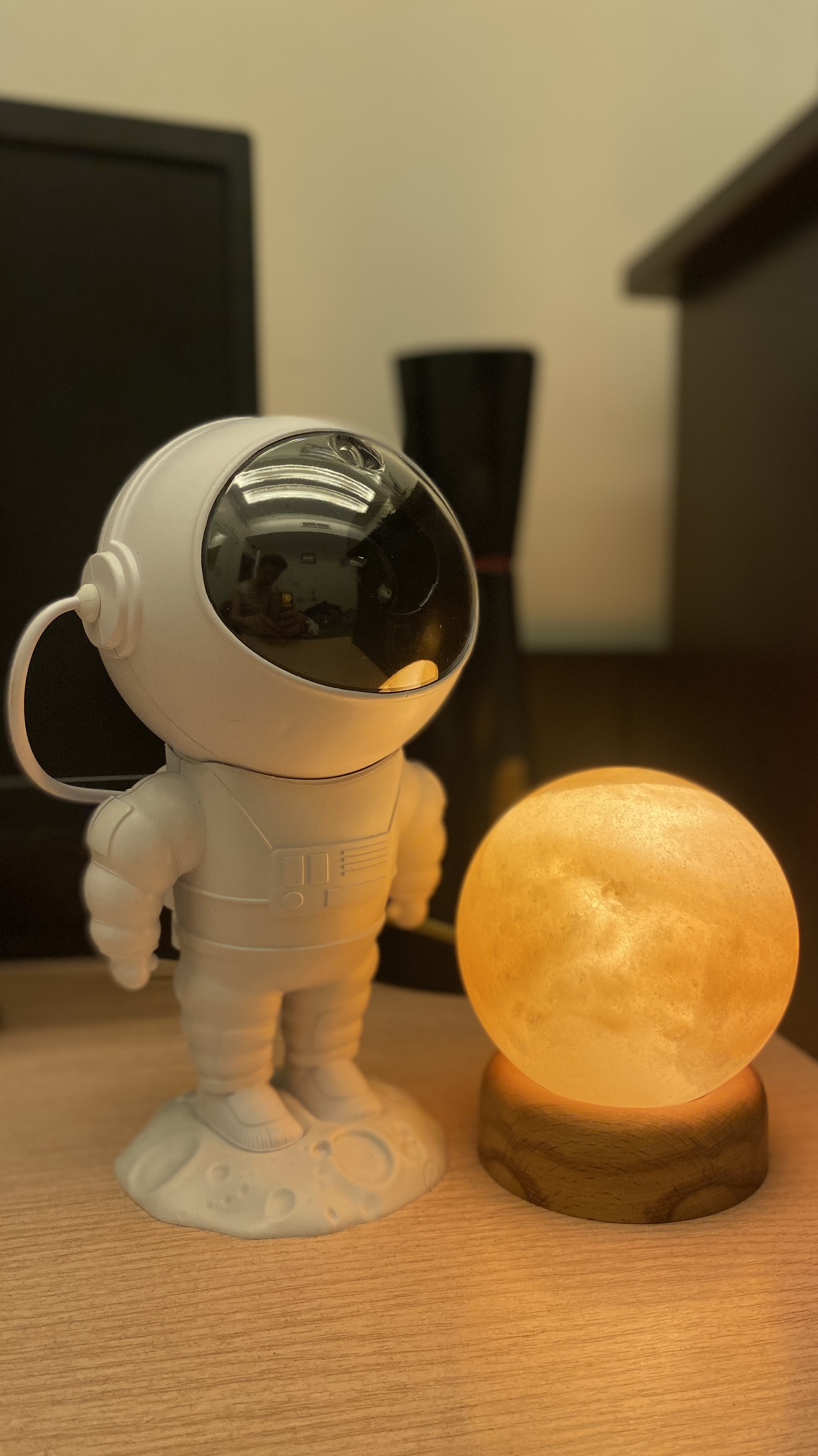 سر و بدن فضانورد به صورت مغناطیسی به هم متصل هستند که می توانند 360 درجه بچرخند که تنظیم زاویه پرتاب سحابی را بدون محدودیت تسهیل می کند.علاوه بر این، پایه ماه قابل جدا شدن است و بازوها نیز می توانند تاب بخورند.می توانید آن را در حالت های مختلف قرار دهید. این محصول علاوه بر یک پروژکتور، یک دکور رومیزی دوست داشتنی هم هست.